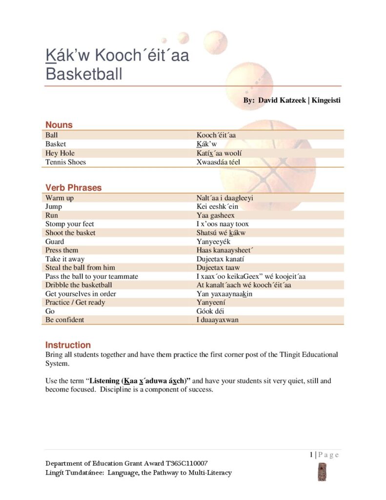 1 | P a g e Department of Education Grant Award T365C110007 Lingít Tundatánee: Language, the Pathway to Multi-Literacy Kák’w Kooch´éit´aa Basketball By: David Katzeek | Kingeisti Nouns Ball Kooch´éit´aa Basket Kák’w Hey Hole Katíx´aa woolí Tennis Shoes Xwaasdáa téel Verb Phrases Warm up Nalt´aa i daagleeyi Jump Kei eeshk´ein Run Yaa gasheex Stomp your feet I x’oos naay toox Shoot the basket Shatsú wé kákw Guard Yanyeeyék Press them Haas kanaaysheet´ Take it away Dujeetax kanatí Steal the ball from him Dujeetax taaw Pass the ball to your teammate I xaax´oo keikaGeex” wé koojeit´aa Dribble the basketball At kanalt´aach wé kooch´éit´aa Get yourselves in order Yan yaxaaynaakin Practice / Get ready Yanyeení Go Góok déi Be confident I duaayaxwan Instruction Bring all students together and have them practice the first corner post of the Tlingit Educational System. Use the term “Listening (Kaa x´aduwa áxch)” and have your students sit…