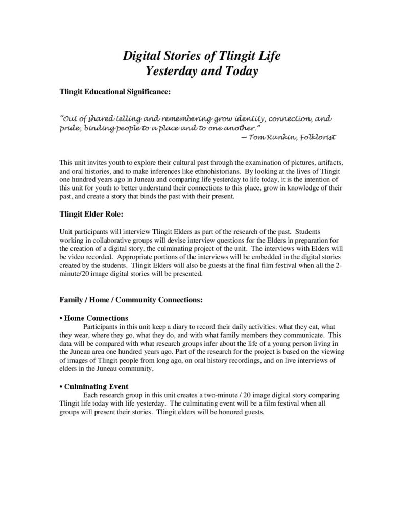 Digital Stories of Tlingit Life Yesterday and Today Tlingit Educational Significance: “Out of shared telling and remembering grow identity, connection, and pride, binding people to a place and to one another.” — Tom Rankin, Folklorist This unit invites youth to explore their cultural past through the examination of pictures, artifacts, and oral histories, and to make inferences like ethnohistorians. By looking at the lives of Tlingit one hundred years ago in Juneau and comparing life yesterday to life today, it is the intention of this unit for youth to better understand their connections to this place, grow in knowledge of their past, and create a story that binds the past with their present. Tlingit Elder Role: Unit participants will interview Tlingit Elders as part of the research of the past. Students working in collaborative groups will devise interview questions for the Elders in preparation for the creation of a digital…