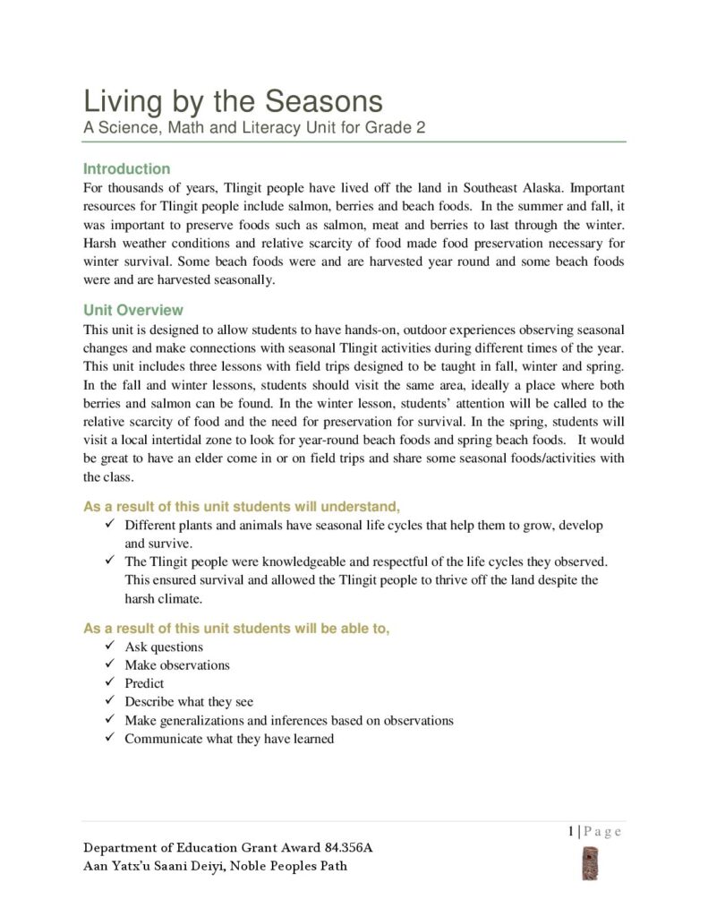 1 | P a g e Department of Education Grant Award 84.356A Aan Yatx’u Saani Deiyi, Noble Peoples Path Living by the Seasons A Science, Math and Literacy Unit for Grade 2 Introduction For thousands of years, Tlingit people have lived off the land in Southeast Alaska. Important resources for Tlingit people include salmon, berries and beach foods. In the summer and fall, it was important to preserve foods such as salmon, meat and berries to last through the winter. Harsh weather conditions and relative scarcity of food made food preservation necessary for winter survival. Some beach foods were and are harvested year round and some beach foods were and are harvested seasonally. Unit Overview This unit is designed to allow students to have hands-on, outdoor experiences observing seasonal changes and make connections with seasonal Tlingit activities during different times of the year. This unit includes three lessons with field…