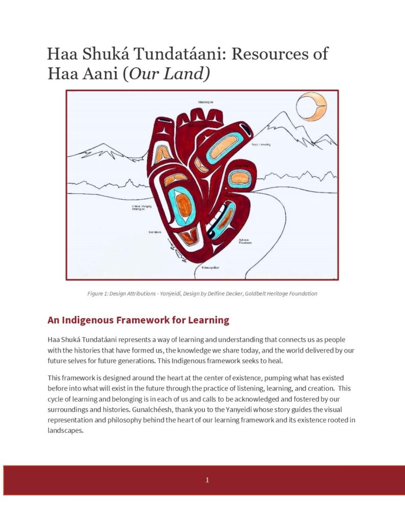 1 Haa Shuká Tundatáani: Resources of Haa Aani (Our Land) Figure 1: Design Attributions – Yanÿeidí, Design by Delfine Decker, Goldbelt Heritage Foundation An Indigenous Framework for Learning Haa Shuká Tundatáani represents a way of learning and understanding that connects us as people with the histories that have formed us, the knowledge we share today, and the world delivered by our future selves for future generations. This Indigenous framework seeks to heal. This framework is designed around the heart at the center of existence, pumping what has existed before into what will exist in the future through the practice of listening, learning, and creation. This cycle of learning and belonging is in each of us and calls to be acknowledged and fostered by our surroundings and histories. Gunalchéesh, thank you to the Yanyeidi whose story guides the visual representation and philosophy behind the heart of our learning framework and its…