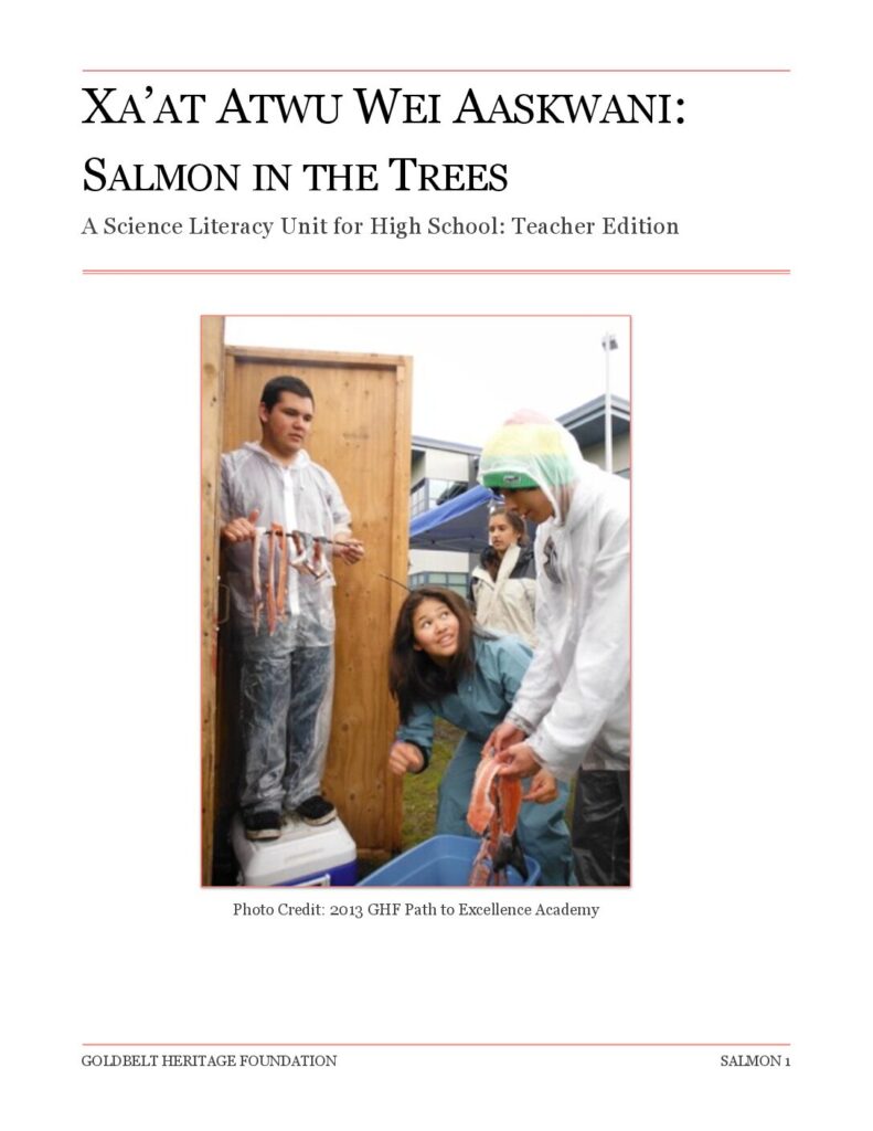 XA’AT ATWU WEI AASKWANI: SALMON IN THE TREES A Science Literacy Unit for High School: Teacher Edition GOLDBELT HERITAGE FOUNDATION SALMON 1 Photo Credit: 2013 GHF Path to Excellence Academy Xa’at Atwu Wei Aaskwani: Salmon in the Trees Place-based learning extensions for a high school ecology class Introduction to Place-Based Education-Written By Paul K. Berg Alaskan public education has historically excluded Native culture and knowledge from the curriculum. In the last decades of the 20th century, the education system strove to appear outwardly sympathetic towards Alaska Native cultures, but remained structurally resistant to Native ways of knowing (Thornton, 2008 Oxford University’s Place as Education’s Source). However, we are beginning to realize that no one culture has a monopoly on reality. To ignore the ancient wisdom of those who have lived and prospered in this challenging environment for thousands of years is to court disaster. An excellent way of making…