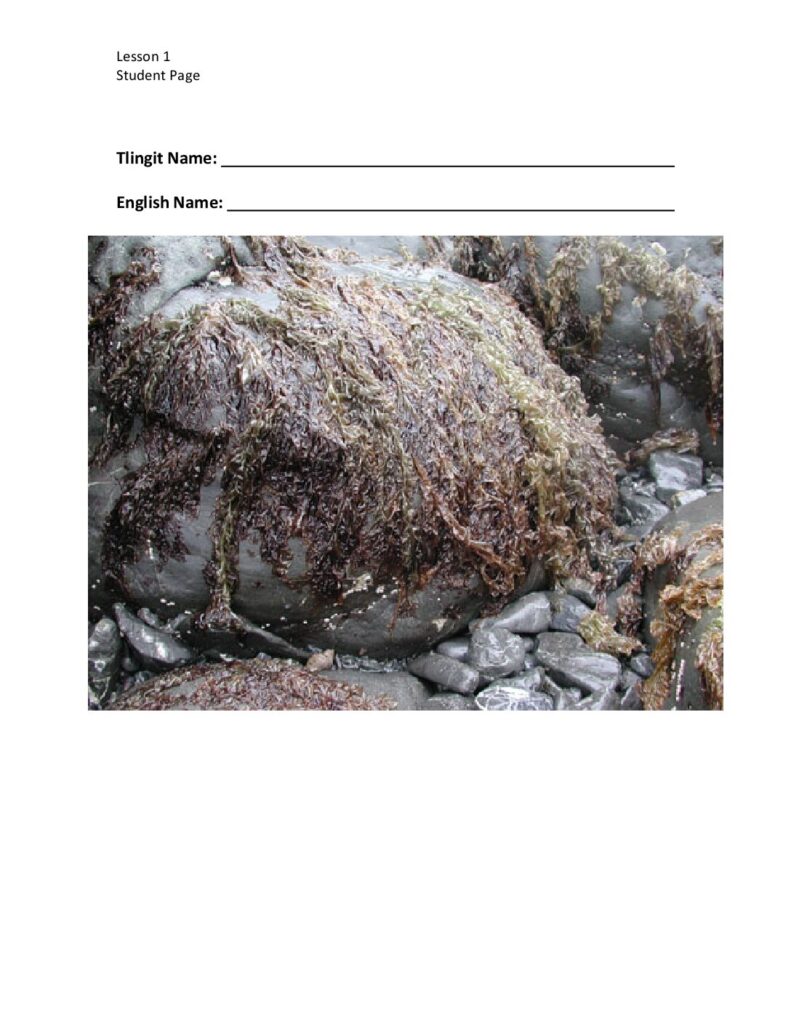 Lesson 1 Student Page Tlingit Name: English Name: Lesson 1 Student Page Tlingit Name: English Name: Lesson 4 Student Page Exposed Shoreline Picture Lesson 4 Student Page Exposed Shoreline Picture Lesson 4 Student Page Protected Shoreline Lesson 4 Student Page Protected Shoreline Héen Táanáx Kayaaní Dísi: Laak’ásk ka K’aach Plants that grow in the water month: Black Seaweed and Red Ribbon Seaweed A Literacy and Science Unit Grades 6-8 Pa ge 1 Overview This place-based unit explores indigenous seaweed and the historical and contemporary value of seaweed to the Tlingit people. The unit begins with the oral narrative Raven and the Tides. This story explains how Raven released the tides so that beach foods became available for all. During this unit students identify the nutritional value of seaweed and develop an enduring understanding for how people who harvest marine life are part of an interconnected system. During this unit, students…
