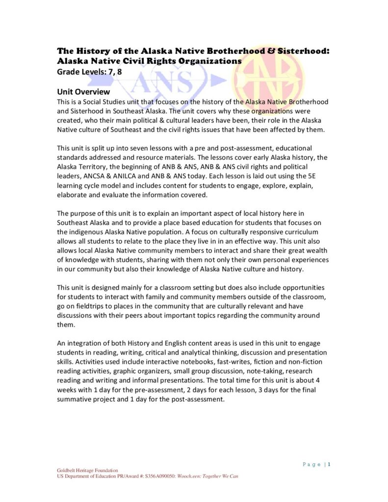 P a g e | 1 Goldbelt Heritage Foundation US Department of Education PR/Award #: S356A090050: Wooch.een: Together We Can The History of the Alaska Native Brotherhood & Sisterhood: Alaska Native Civil Rights Organizations Grade Levels: 7, 8 Unit Overview This is a Social Studies unit that focuses on the history of the Alaska Native Brotherhood and Sisterhood in Southeast Alaska. The unit covers why these organizations were created, who their main political & cultural leaders have been, their role in the Alaska Native culture of Southeast and the civil rights issues that have been affected by them. This unit is split up into seven lessons with a pre and post-assessment, educational standards addressed and resource materials. The lessons cover early Alaska history, the Alaska Territory, the beginning of ANB & ANS, ANB & ANS civil rights and political leaders, ANCSA & ANILCA and ANB & ANS today. Each lesson…