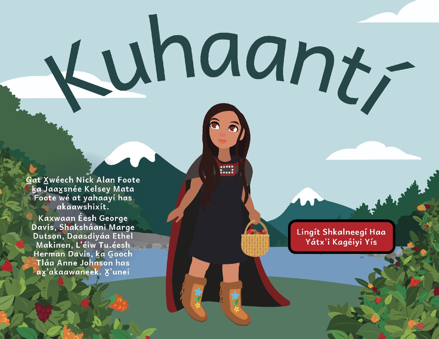 Lingít translations by Kaxwaan Éesh George Davis, Shaksháani Marge Dutson, Daasdiyáa Ethel Makinen, L’éiw Tu.éesh Herman Davis, Gooch Tlảa Anne Johnson, and X’unei Lance Twitchell.